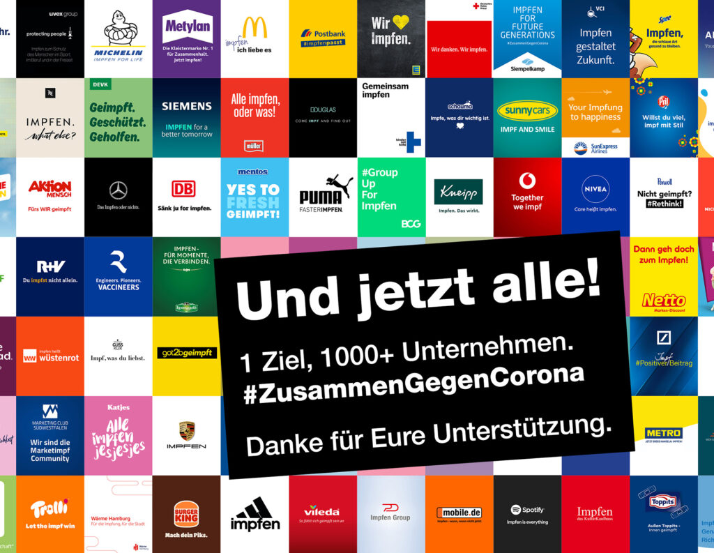 Wir brauchen mehr Menschen, die sich impfen lassen! Statt „man müsste mal was machen“, haben wir einfach was gemacht, bei dem alle mitmachen können. Unsere Idee: Marken nutzen ihre große Reichweite und machen Werbung fürs Impfen, mit ihren bekannten Slogans – umgetextet in Slogans fürs Impfen. Die Resonanz hat uns umgehauen: Über 150 Marken und ihre Werbeagenturen hatten für den Start am 07.12.2021 zugesagt und gleichzeitig ihre „Impf-Claims“ auf ihren Social Media Kanälen veröffentlicht. Somit konnten weitere hunderte von Unternehmen und Institutionen mobilisiert werden, die sich dieser in dieser Form beispielslosen Bewegung angeschlossen haben. Vier Tage später sind wir bereits bei über 1.000 Marken. Viele davon sind Konkurrenten, aber niemand hat gezögert. Denn statt Gegeneinander brauchen wir jetzt Miteinander.